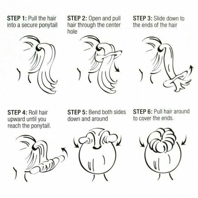 Directions: Pull hair into a secure ponytail. Open and pull hair through the center hole. Slide down to ends of hair. Roll hair upward until you reach ponytail. Bend both sides down and around. Pull hair around to cover ends.