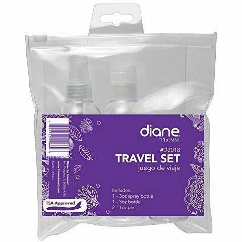 This Diane Bottle Travel Set Pouch includes one 3oz spray bottle, one 3oz bottle, and two 1oz jars.
