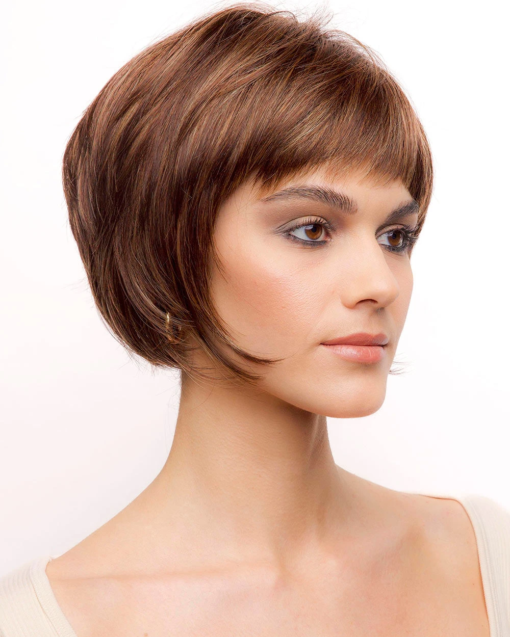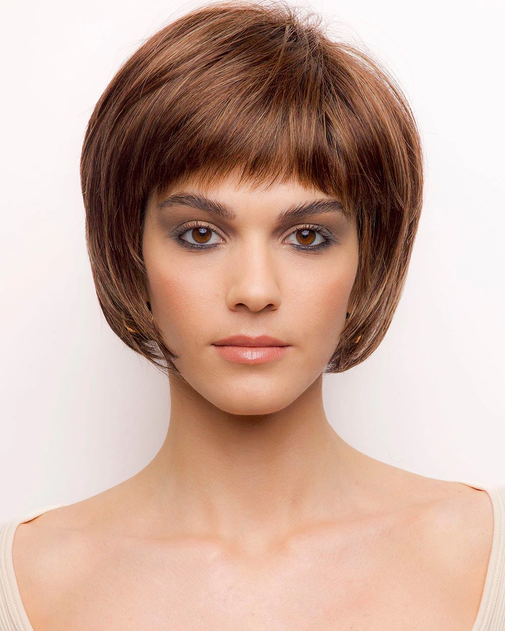 Nell from our Rene of Paris Hi-Fashion Collection is a short-length synthetic wig. This straight ready-to-wear wig is a short bob with a full fringe. Nell is a sleek and sophisticated style. The full bangs will flatter your eyes and the face-framing layer accentuate your best facial features. If you want a playful and bold style to gain attention, Nell is what you’re looking for. Nell is machine-made with adjustable tabs in the back nape area to allow a more comfortable fit. This result is a comfortable fit with a natural look that is both fashionable and easy to wear.