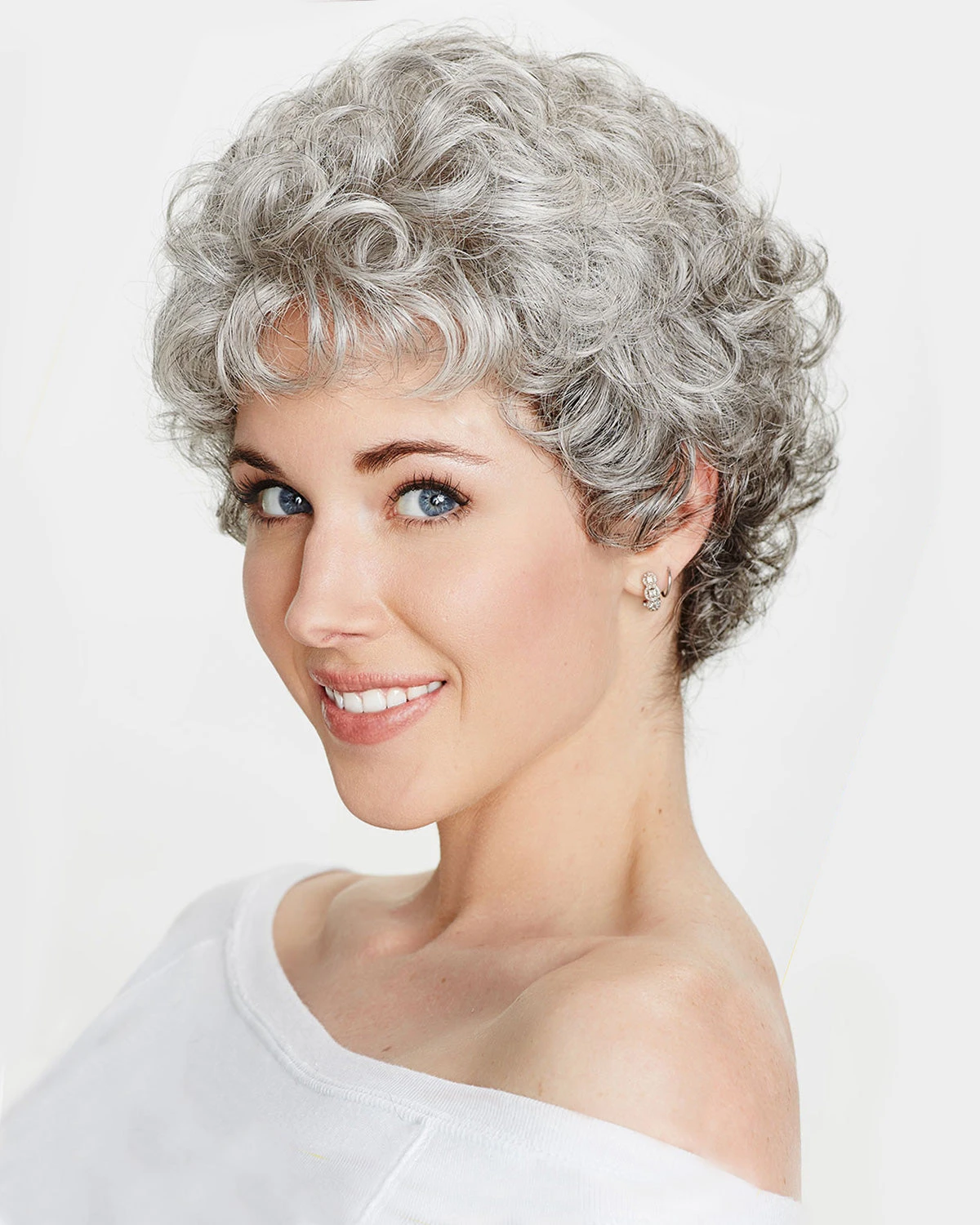 Petite Dream with short soft soft curls in a petite cap head size style with a hand-tied mono cap construction for added realism. Featuring a smooth skin base at the top of the cap mimics the appearance of a natural scalp and hair growth. Overall greater realism and versatility define this look. A perfect choice for those with hair loss and thinning hair.