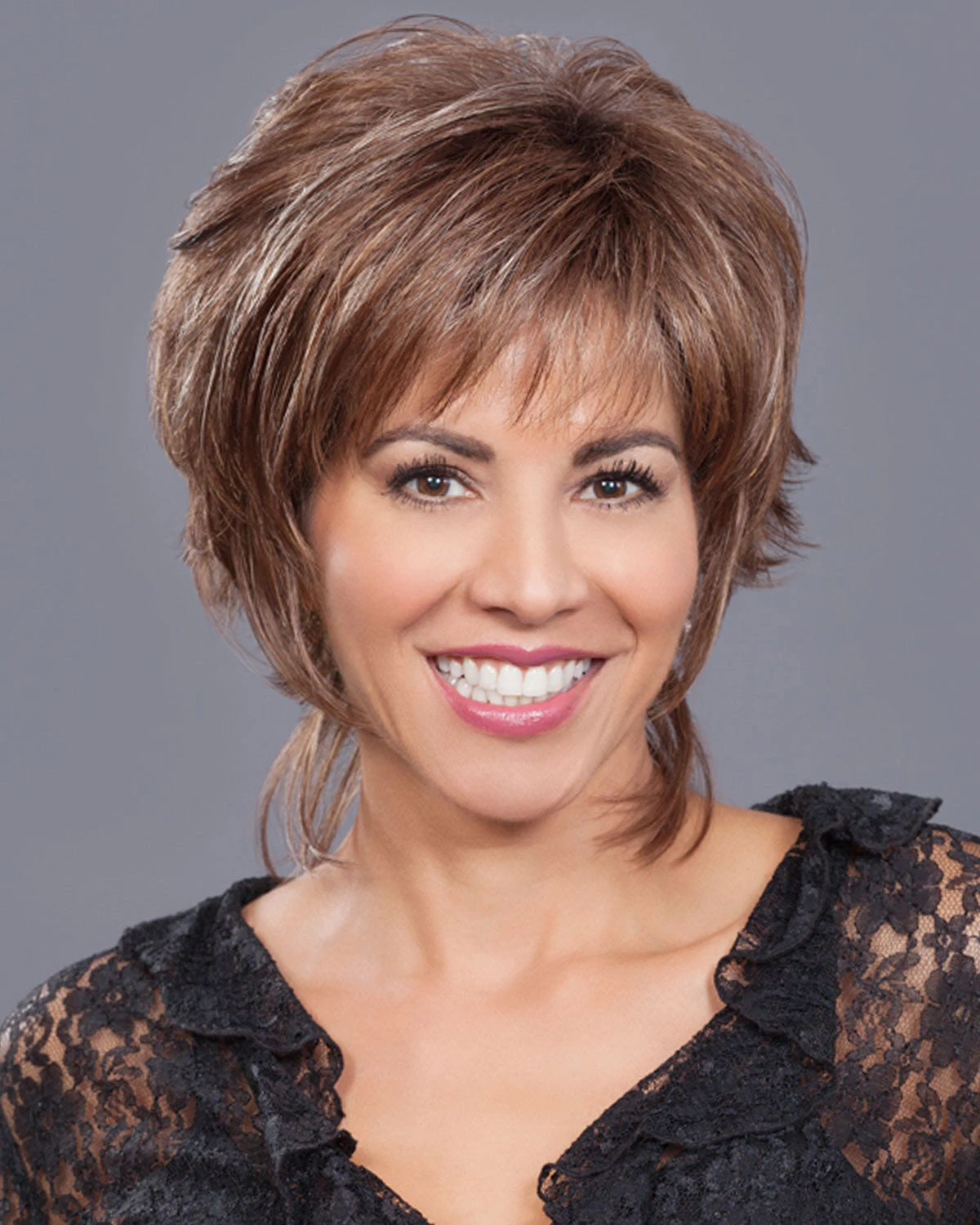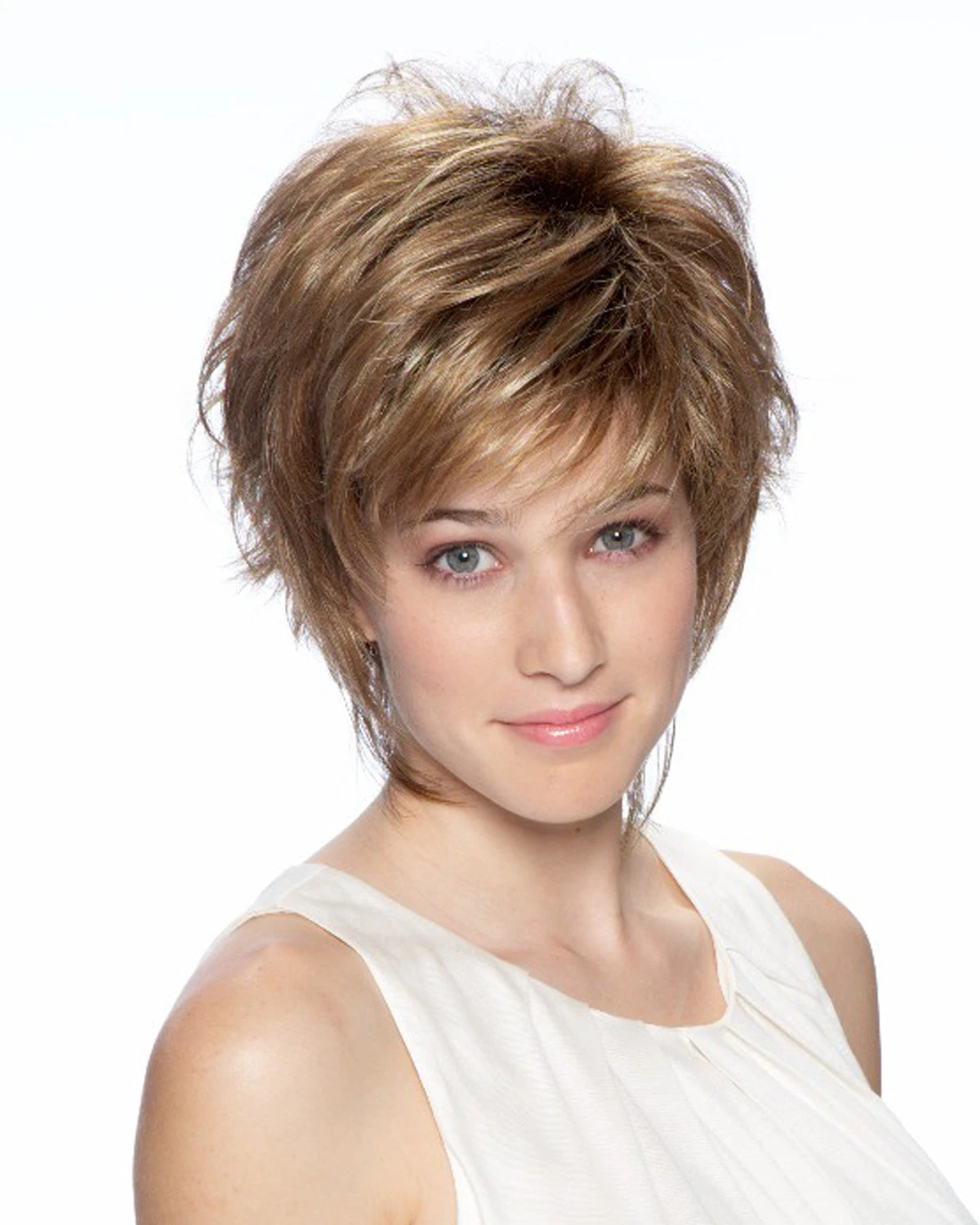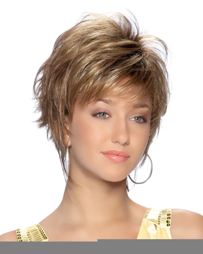 Short, simple and chic! Feathery layers and a fashionably progressive finish in the nape area give this cut its runway appeal. Ready-to-wear effortless finger styled. A capless construction of open wefts along inside of cap provides delightful airy lightweight wear. Adjusters at the nape and bendable ear tabs offer comfort and security in fit.